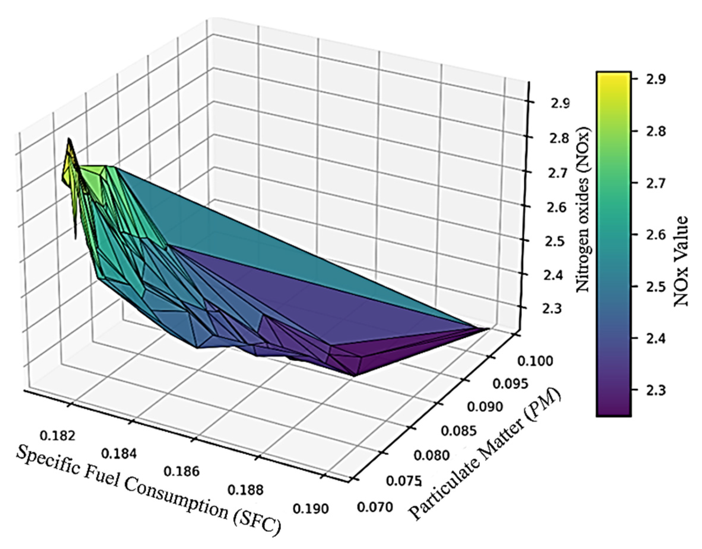 45] varied six controllable parameters within ranges defined by MAN project-guide recommendations, Diesel-RK calibration and combustion-stability considerations. Mechanical and environmental constraints were enforced to filter infeasible operating points. Consequently, every alternative on the Pareto front analyzed in this paper corresponds to a feasible full-load operating point of the selected low-speed marine diesel engine, rather than to multiple distinct load or speed regimes
