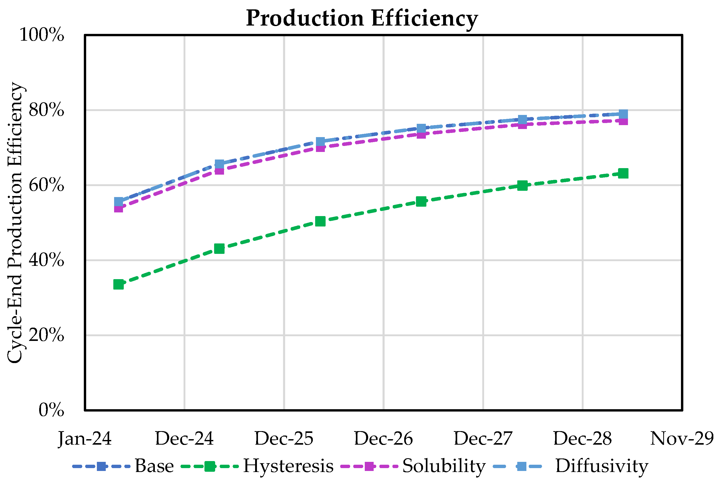 3.3. Impact of Hysteresis, Diffusivity, and Solubility on Withdrawal Efficiency