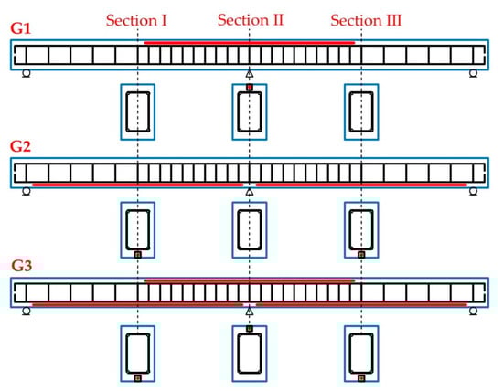 The strengthening configurations are illustrated in Figure 2. In beam G1, GFRP reinforcement was installed only above the middle support; in beam G2, it was placed in the tension zone of both spans; while beam G3 was strengthened both above the support and in the span zones.