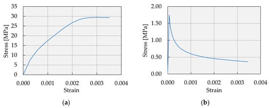 The strain corresponding to the concrete’s tensile strength was calculated as εcr = 0.00006896. This value marks the limit of the elastic response of the examined concrete in tension. Based on the adopted model, the stress–strain relationship under tensile loading is illustrated in Figure 11b.