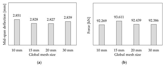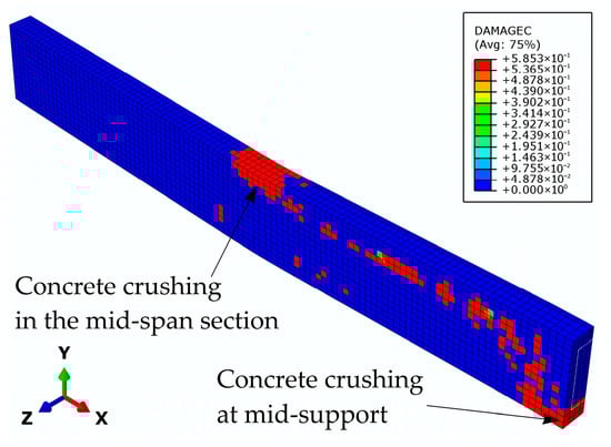 In the experimental setup, the middle support was a simple support, while the end supports were roller supports. Although these supports were not modeled in full detail, appropriate boundary conditions were applied in the numerical simulations. Specifically, at a distance of 100 mm from the beam end, which coincides with the centerline of the roller support, the displacements in the y direction at the bottom nodes were constrained, allowing translation in the beam axis direction (Figure 10c). In the middle section the displacements in the y direction were constrained to a length of 100 mm, which corresponds to the support width (50 mm due to symmetry). This, together with the boundary conditions on the symmetry planes (constrained translations in x and z directions), represents simple support (Figure 10d). During the experimental tests, loads were applied using steel bearing plates positioned at one-half points along the spans. In the numerical models, this setup was simplified by applying surface pressure directly to the top face of the concrete beams, omitting the steel plates (Figure 10a).