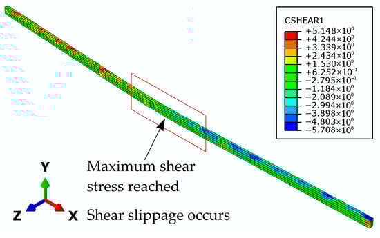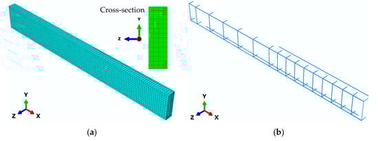The FE models were developed to reflect the geometry of the beams tested in the laboratory (see Figure 1 and Figure 2). Due to the double symmetry, only one quarter of the beams were modeled in order to reduce the computational time. The configuration of beam G3, including the boundary and symmetry conditions applied in the planes normal to the x- and z-axes, is illustrated in Figure 10a, while Figure 10b presents the layout of the internal reinforcement and the GFRP bars. The other beam models follow a similar configuration, with minor modifications in the epoxy and GFRP components depending on the RC beam reinforcement cases.
