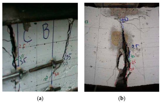 In the absence of experimental data, the concrete’s tensile strength (ft) was determined based on the expression suggested in [47], which relates it to the compressive strength of concrete (fc) at the time of beam testing (reference compressive strength obtained as the difference between the compressive strength mean value and the standard deviation, see Table 1):