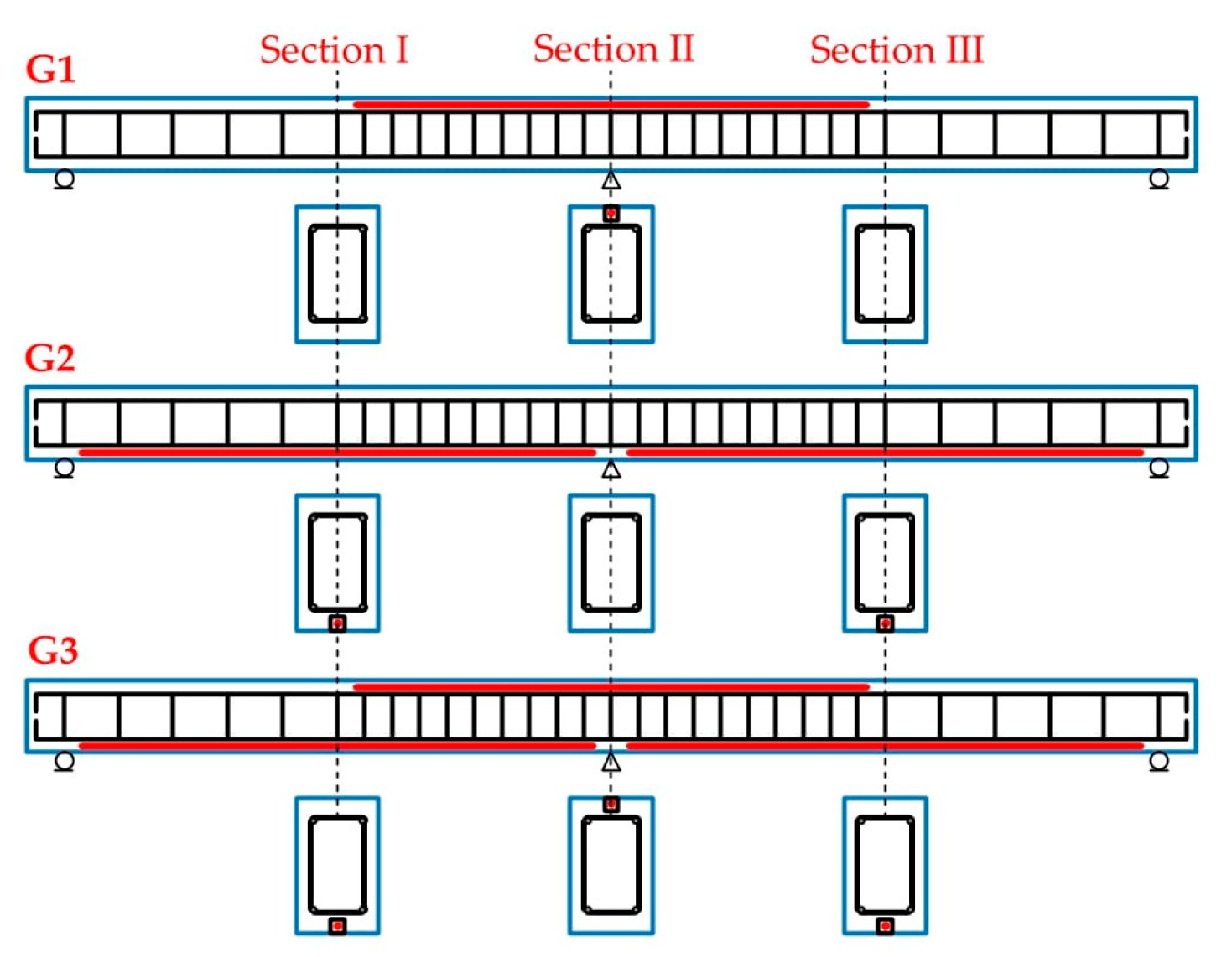 - Abdallah, M.; Al Mahmoud, F.; Khalil, N.; Khelil, A. Effect of the Strengthening Patterns on the Flexural Performance of RC Continuous Beams Using FRP Reinforcements. Eng. Struct. 2023, 280, 115657. [Google Scholar] [CrossRef]
