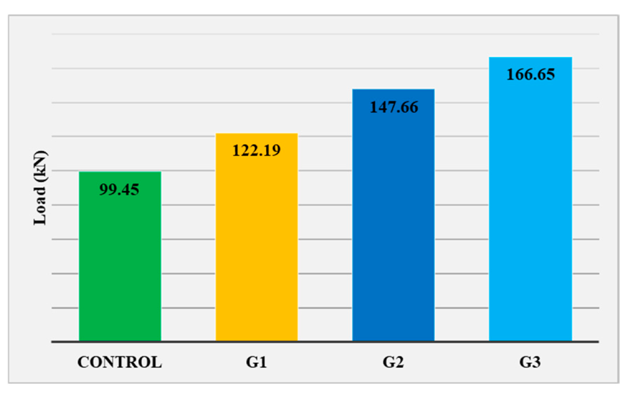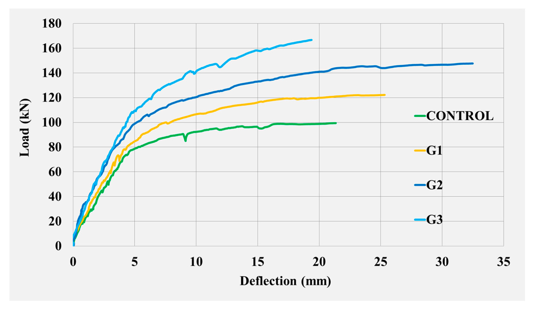 - Effectiveness of strengthening: Even a relatively small amount of GFRP reinforcement considerably increased the flexural load capacity of the beams compared to the control specimen.
