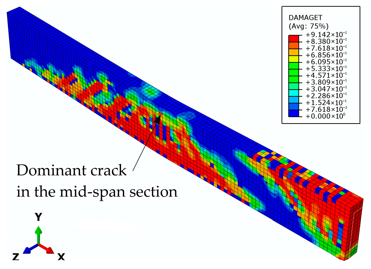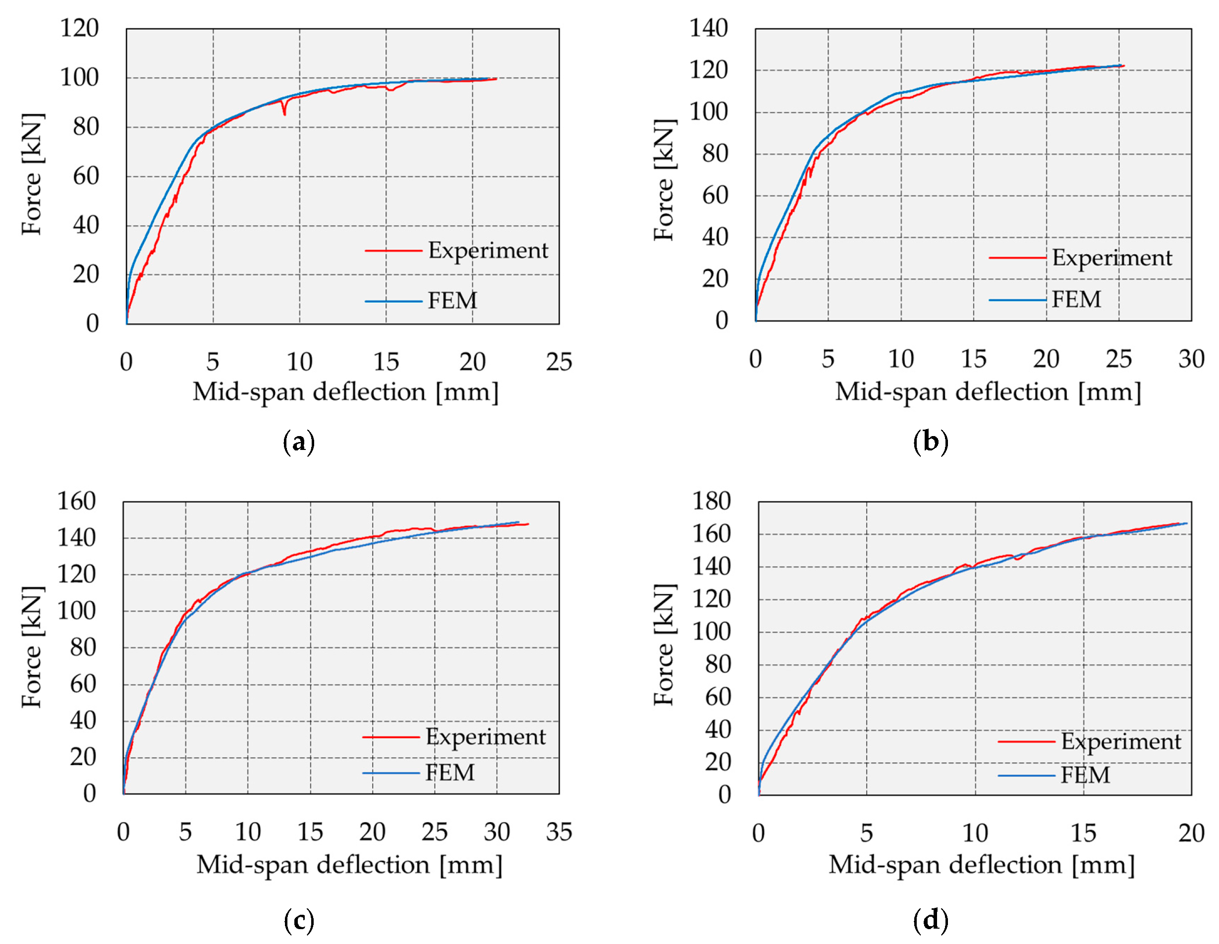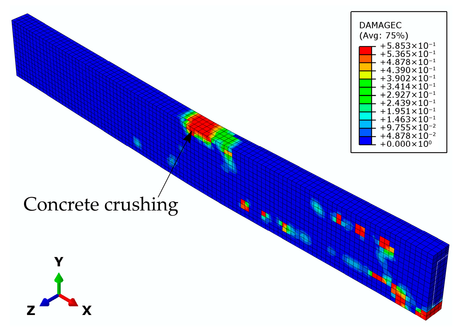 - Numerical validation: The finite element models developed in Abaqus/Standard accurately reproduced the experimental responses, including stiffness, crack formation, ultimate capacity, and strains, confirming the suitability of the modeling approach for further parametric studies.