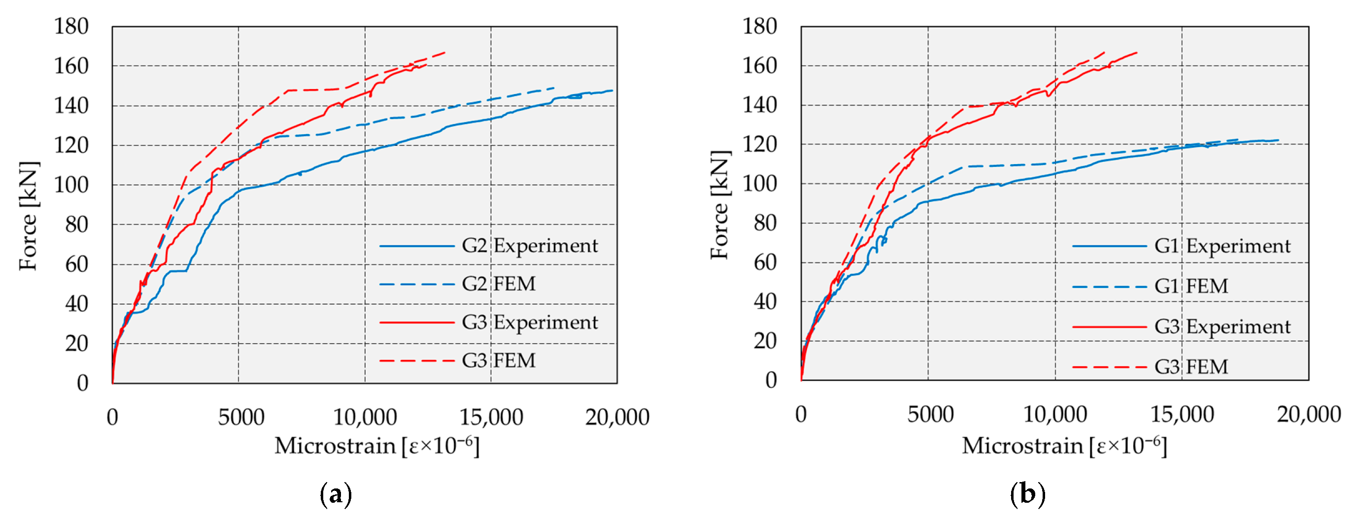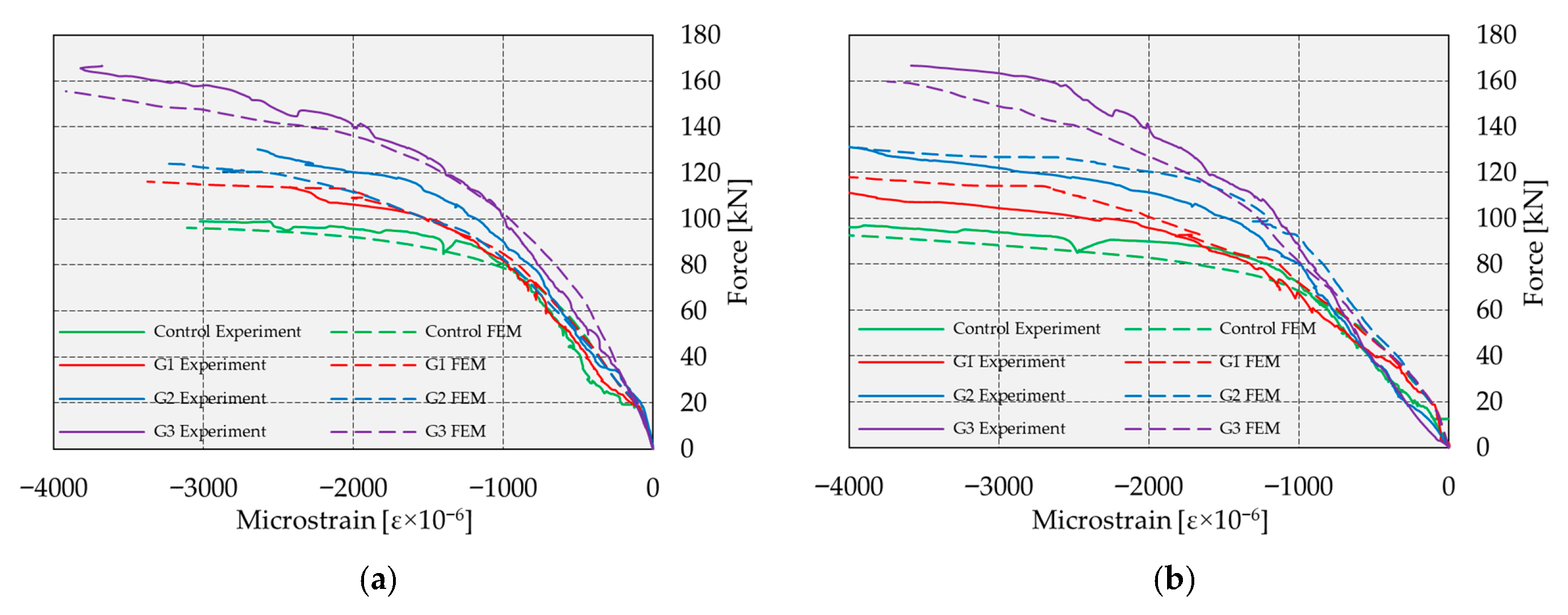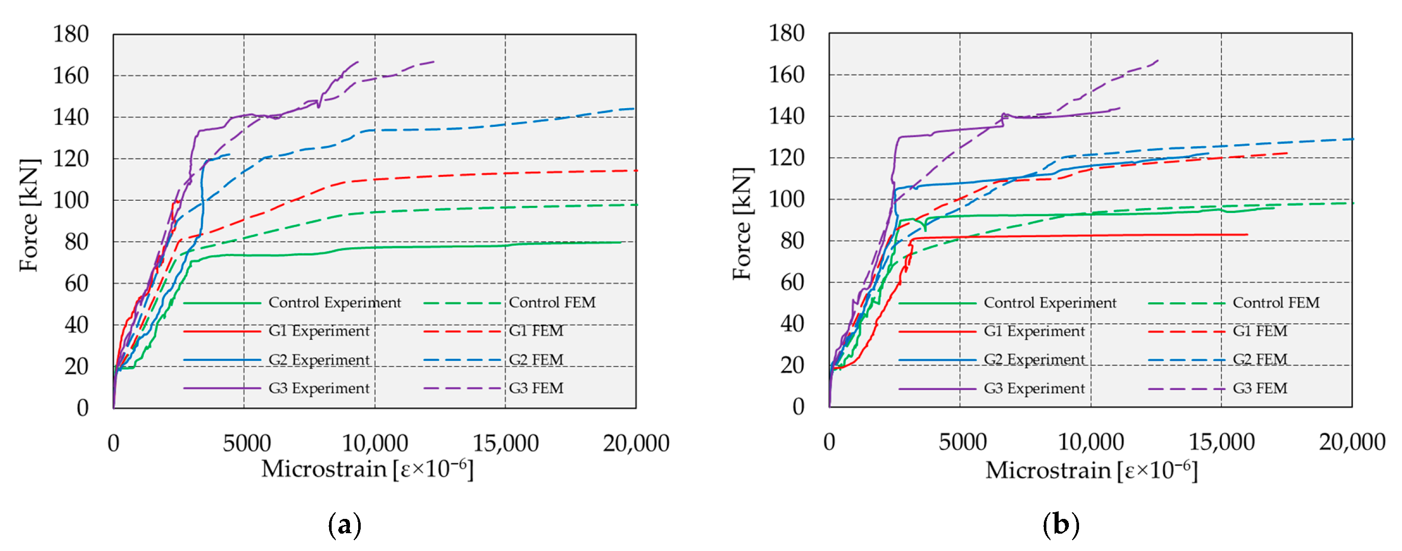 - Numerical validation: The finite element models developed in Abaqus/Standard accurately reproduced the experimental responses, including stiffness, crack formation, ultimate capacity, and strains, confirming the suitability of the modeling approach for further parametric studies.