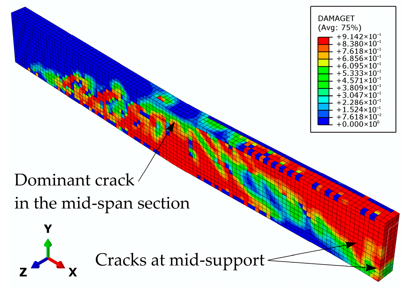 - Future work: Further studies should focus on parametric numerical analyses to optimize NSM strengthening configurations. Variables such as FRP bar length, cross-sectional area, and placement can be systematically modified to determine the minimum reinforcement required to achieve the desired flexural performance. This approach would enable designers to efficiently tailor strengthening interventions for continuous SCC beams while ensuring safety and serviceability criteria. Additionally, long-term behavior, cyclic loading, and environmental effects (temperature, moisture, freeze–thaw) should be investigated to provide comprehensive design guidelines.