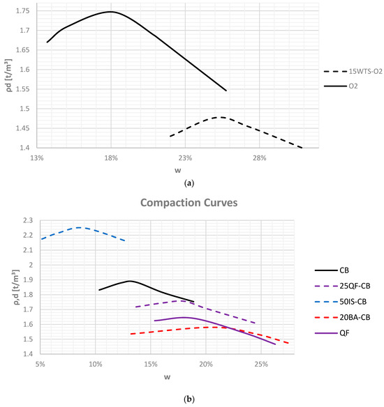 Compaction curves for the best soil–residue mixtures: (a) Soil O2 and 15WTS-O2. (b) Soil CB, QF, 25QF-CB, 50IS-CB and 20BA-CB.