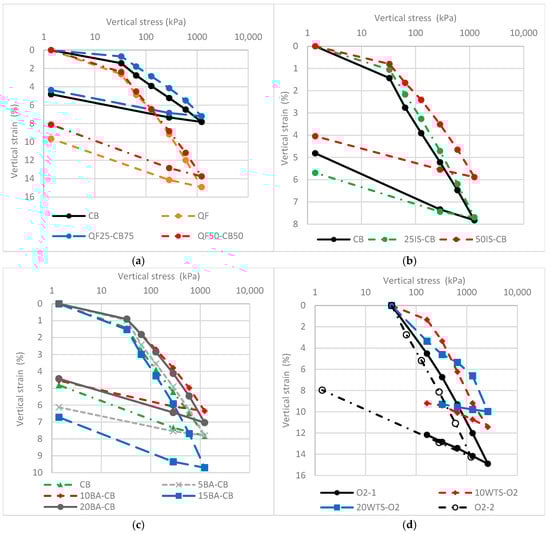 Confined compression tests—vertical strain as function of effective vertical strain: (a) soil CB and mixtures with QF; (b) soil CB and mixtures with IS; (c) soil CB and mixtures with BA; (d) soil O2 and mixtures with WTS.
