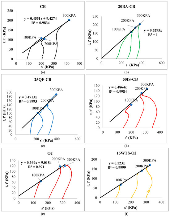 Stress curves for the different materials: (a) soil CB; (b) soil CB with 20% of BA; (c) soil CB with 25% of QF; (d) soil CB with 50% of IS; (e) soil O2; (f) soil O2 with 15% of WTS.