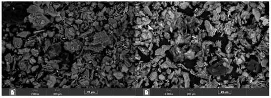 The images of the soil–residue mixtures (Figure 10 and Figure 11) illustrate how the incorporation of residues alters the microstructure. For example, the 15WTS-O2 mixture (Figure 10, left) exhibits a finer, more compact structure, visually supporting the recorded decrease in permeability and changes in compaction behavior [33]. Similarly, the 20BA-CB mixture (Figure 10, right) reveals a sponge-like, porous structure with visible cavities, which likely contribute to the observed fissure formation and increased permeability [29]. In contrast, the 50IS-CB mixture (Figure 11, right) displays a distinctly granular and coarser texture, reinforcing the mechanical improvements and higher friction angle measured during the triaxial tests [23].