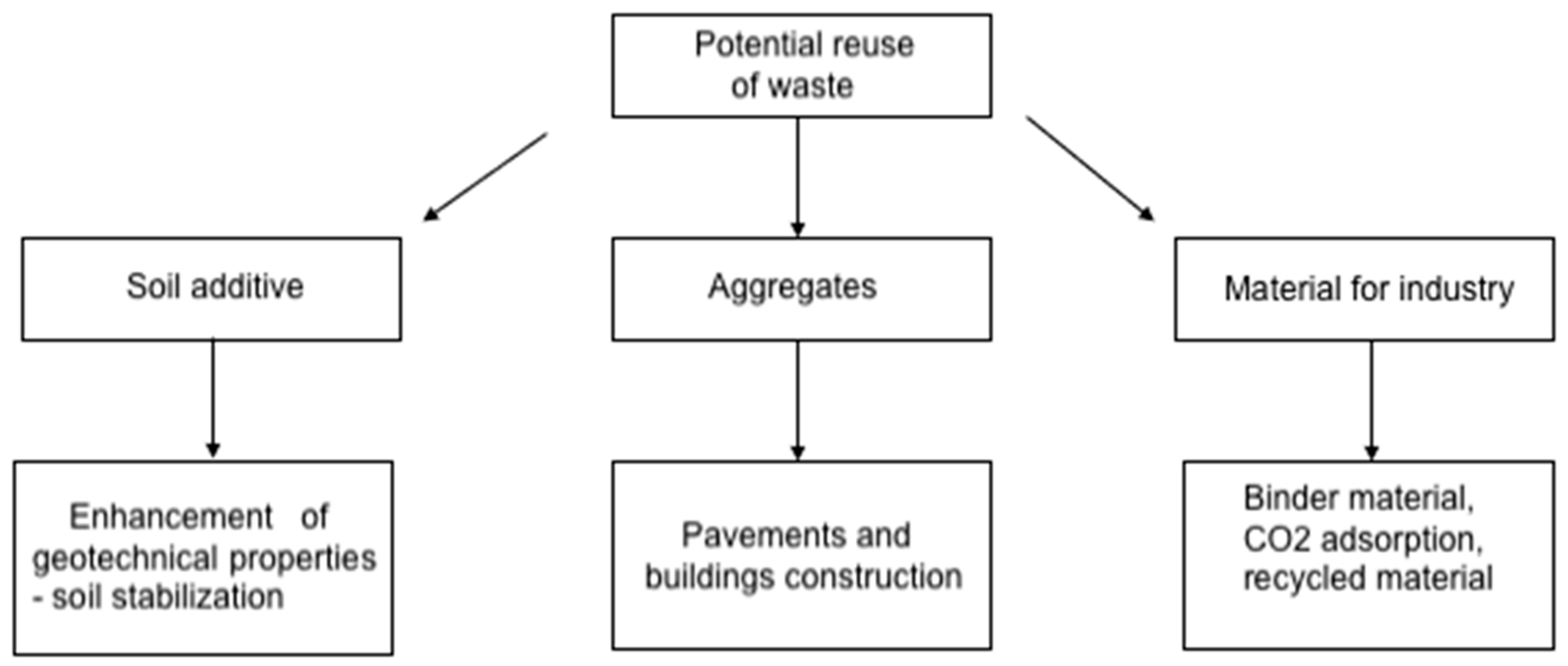- Almeida, J.; Ribeiro, A.; Silva, A.; Faria, P. Overview of mining residues incorporation in construction materials and barriers for full-scale application. J. Build. Eng. 2020, 29, 101215. [Google Scholar] [CrossRef]