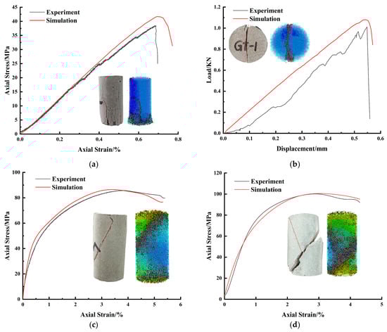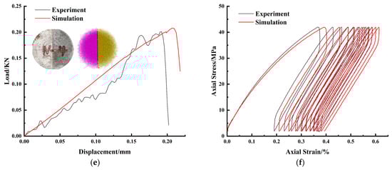 (a) Simulation comparison curve of cement stone uniaxial compression test; (b) simulation comparison curve of cement stone Brazilian splitting test; (c) simulation comparison curve of cement stone triaxial compression test under 10 MPa confining pressure; (d) simulation comparison curve of cement stone triaxial compression test under 15 MPa confining pressure; (e) simulation comparison curve of casing–cement stone Brazilian splitting test; (f) simulation comparison curve of cement stone cyclic loading–unloading test with 15 MPa confining pressure and 50 MPa load upper limit.