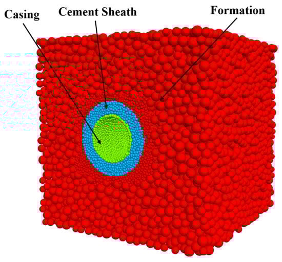 Based on the calibration results of the mesoscopic parameters of the aforementioned cement stone discrete element model, a three-dimensional discrete element model of the casing–cement sheath–formation assembly was established (Figure 3). The inner and outer diameters of the casing are 115/127.00 mm, and the outer diameter of the cement sheath is 168.28 mm. Based on Saint-Venant’s principle, the side length of the model is more than 5 times the wellbore diameter to eliminate the influence of end effects; to simulate the integrity of the cement sheath at the horizontal section of a shale oil well in Xinjiang, the corresponding vertical depth of the model is set to 3700 m, with the maximum horizontal in situ stress, minimum horizontal in situ stress, and vertical in situ stress being 107.0, 96.0, and 92.0 MPa, respectively. Uniform loads are applied to the outer part of the model through servo-controlled hexahedral boundary walls to simulate three-dimensional in situ stresses, and uniform loads are applied via servo-controlled wellbore-shaped walls to simulate the cyclic loading–unloading process of the casing internal pressure. Since the considered model is static, the damping dissipation value is set to 0.7 [34], a commonly used value in statics, to reduce the model calculation time. The maximum and minimum particle sizes are 3 mm/4.98 mm, in which the maximum particle diameter is 1.66 times the minimum diameter, corresponding to 75,455 particles. Due to the short duration of the multi-stage fracturing process, time-dependent effects such as creep are not considered in the model.