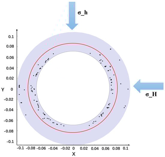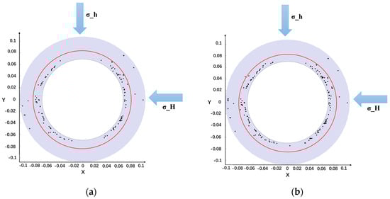 Figure 4 shows the microcrack distribution results of the cement stone under the conditions of a casing internal pressure range of 35–80 MPa and 30 fracturing stages (a microcrack is formed when the bonding link between a pair of particles is broken; thus, the number of microcracks is equal to the number of broken bonding links between particles, where σH in the figure denotes the maximum horizontal in situ stress and σh denotes the minimum horizontal in situ stress). It can be seen that during the multi-stage fracturing process, the microcracks inside the cement stone are mainly distributed near its inner wall, with those within the red circle accounting for more than 90% of the total. The number of microcracks near the outer wall is relatively small, mainly because the stress on the inner wall of the cement stone is greater than that on the outer wall, leading to faster crack initiation and propagation. Meanwhile, the existence of non-uniform in situ stress results in an uneven distribution of circumferential stress in the cement stone, which is reflected in a larger number of microcracks in the direction of the maximum horizontal principal stress and fewer in the direction of the minimum horizontal principal stress.