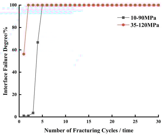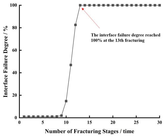 On the basis of evaluating the microcrack distribution of the cement sheath during multi-stage fracturing, the variation law of the failure degree of the first cementing interface with the number of fracturing stages was studied further, as shown in Figure 5. The interface failure degree is defined as the ratio of the failed area of the cemented surface to the total area. It can be seen from Figure 5 that the failure process of the cemented surface can be divided into two stages: In the first stage, no failure occurs on the cemented surface, which is because the plastic accumulation of the cement sheath causes the interface tensile stress during the unloading stage to be less than the bonding strength. When the number of fracturing stages reaches 9, the interface begins to fail, and the failure degree basically changes linearly.
