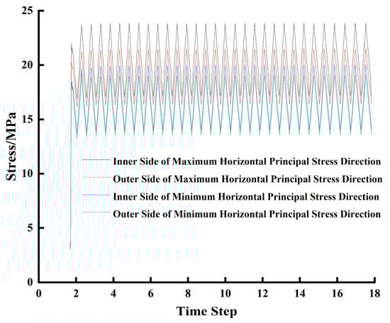 To explain the aforementioned microcrack distribution characteristics of the cement sheath, stress curves of the inner and outer sides in the directions of the maximum and minimum horizontal principal stresses were obtained by monitoring the internal stress of the cement sheath (Figure 6). It can be concluded from the curves that the stress in the direction of the maximum horizontal principal stress is greater than that in the direction of the minimum horizontal principal stress, which concentrates the microcracks in the cement sheath body in the direction of the maximum horizontal principal stress. The stress on the inner side of the cement sheath is greater than that on the outer side, so there are more microcracks on the inner side than on the outer side, which is consistent with Wei Lian et al. [35]’s results.