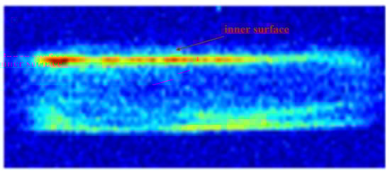 Further, CT scanning was conducted on cement sheath samples to analyze the microcrack distribution law at the first and second cementing interfaces. It can be seen from Figure 9 that dense microcracks develop on the inner side of the cement sheath body. Compared with the numerical simulation results, the first interface in the model was found to be completely debonded after the 13th cycle, which is consistent with the experimental findings. In the model, microcracks in the cement sheath are mainly concentrated near the inner side of the wellbore, and this is also consistent with the experimental results. The above phenomena indicate that the synergistic effect of the microannulus at the first interface and the microcrack propagation in the cement body leads to the sealing failure of the cement sheath, and at the same time confirms the rationality of the three-dimensional discrete element casing–cement sheath–formation model.