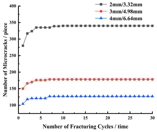 Further, a sensitivity analysis of the model’s particle size was carried out: three sets of parameters with minimum and maximum particle sizes of 2 mm/3.32 mm, 3 mm/4.98 mm, and 4 mm/6.64 mm were selected. Under the conditions of a casing internal pressure of 35–80 MPa and 30 fracturing stages, multi-stage fracturing simulations of the cement stone were performed, respectively. Figure 10 and Figure 11 show the failure degree curves of the first interface of the cement stone and the microcrack growth curves of the cement stone corresponding to different particle sizes, respectively. It can be seen from the figures that the failure degree of the first interface of the cement stone is similar under different particle sizes, and its influence is negligible; in addition, the number of microcracks generated in the cement stone during the first fracturing is maintained at about 80%, and the number gradually decreases until no more are generated in the subsequent fracturing process, with a consistent overall law.