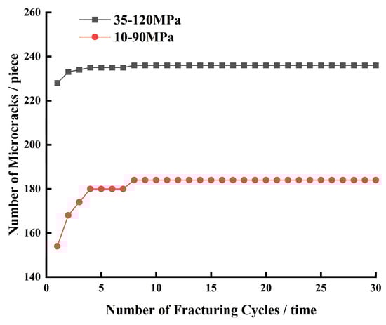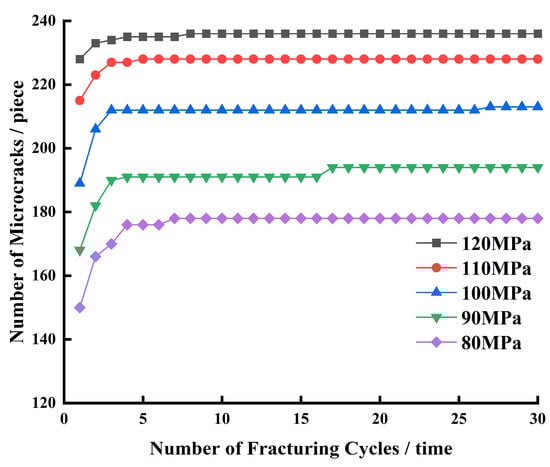 The peak casing internal pressure value was set to vary between 80 and 120 MPa with 30 fracturing stages to analyze the influence of different peak casing internal pressures on the number of microcracks in the cement sheath body. Figure 17 shows the growth curve of the number of microcracks in the cement sheath body with the change in fracturing stages. It can be seen from Figure 17 that there is a positive correlation between the casing internal pressure and microcrack development in the cement sheath body, but the crack evolution under different pressure conditions presents phased characteristics: The first fracturing stage produces the most microcracks, accounting for 84.3–96.6% of the total number of cracks. After that, with the increase in fracturing times, the increment in cracks decreases sharply, and finally, the number of microcracks stabilizes. In addition, under the condition of a high casing internal pressure, the proportion of all microcracks that are generated in the first fracturing is significantly higher than that in the low-pressure group, but the crack increment in the subsequent fracturing stages is significantly lower than that in the low-pressure group.