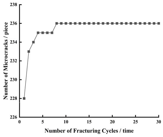 The 30-stage fracturing process was studied under a casing internal pressure range of 35–120 MPa. Figure 15 shows the number of microcracks in the cement sheath body, showing that with the increase in fracturing stages, the number of microcracks in the cement sheath shows a significant growth trend. The first fracturing operation induces 228 microcracks, accounting for more than 96% of the total. When the number of subsequent fracturing stages increases, the growth rate of the number of microcracks gradually slows down and stabilizes. When the number of fracturing stages reaches 8, the number of microcracks essentially no longer increases, showing a three-stage evolution process comprising “rapid growth—decreasing growth rate—stable saturation”.