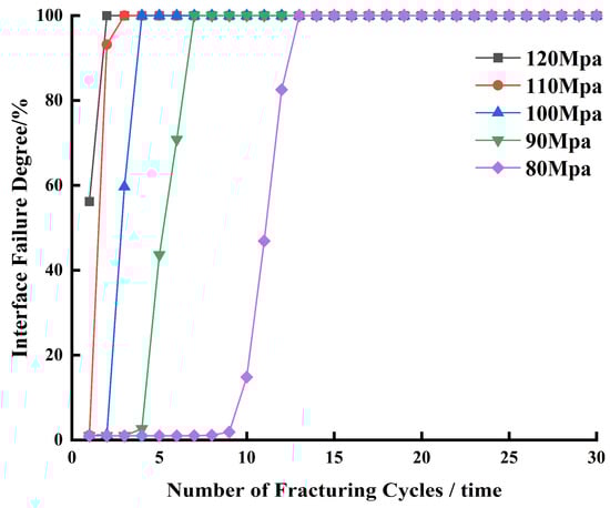 Figure 18 shows the growth curve of the bonding failure degree of the first interface of the cement sheath with the change in fracturing stages. It can be seen from Figure 18 that there is a correlation between the casing internal pressure and the initiation of bonding failure in the cement sheath’s first interface. Specifically, it is manifested as follows: when the casing internal pressure is 120 MPa, the first fracturing cycle causes significant damage to the interface bonding; in the pressure range of 80–110 MPa, although the first fracturing only causes slight damage, with the decrease in the peak casing internal pressure value, the number of cycles required for the first significant damage to the interface bonding shows an increasing trend. This indicates that the higher the casing’s internal pressure level, the earlier the cement sheath interface bonding is completely damaged.