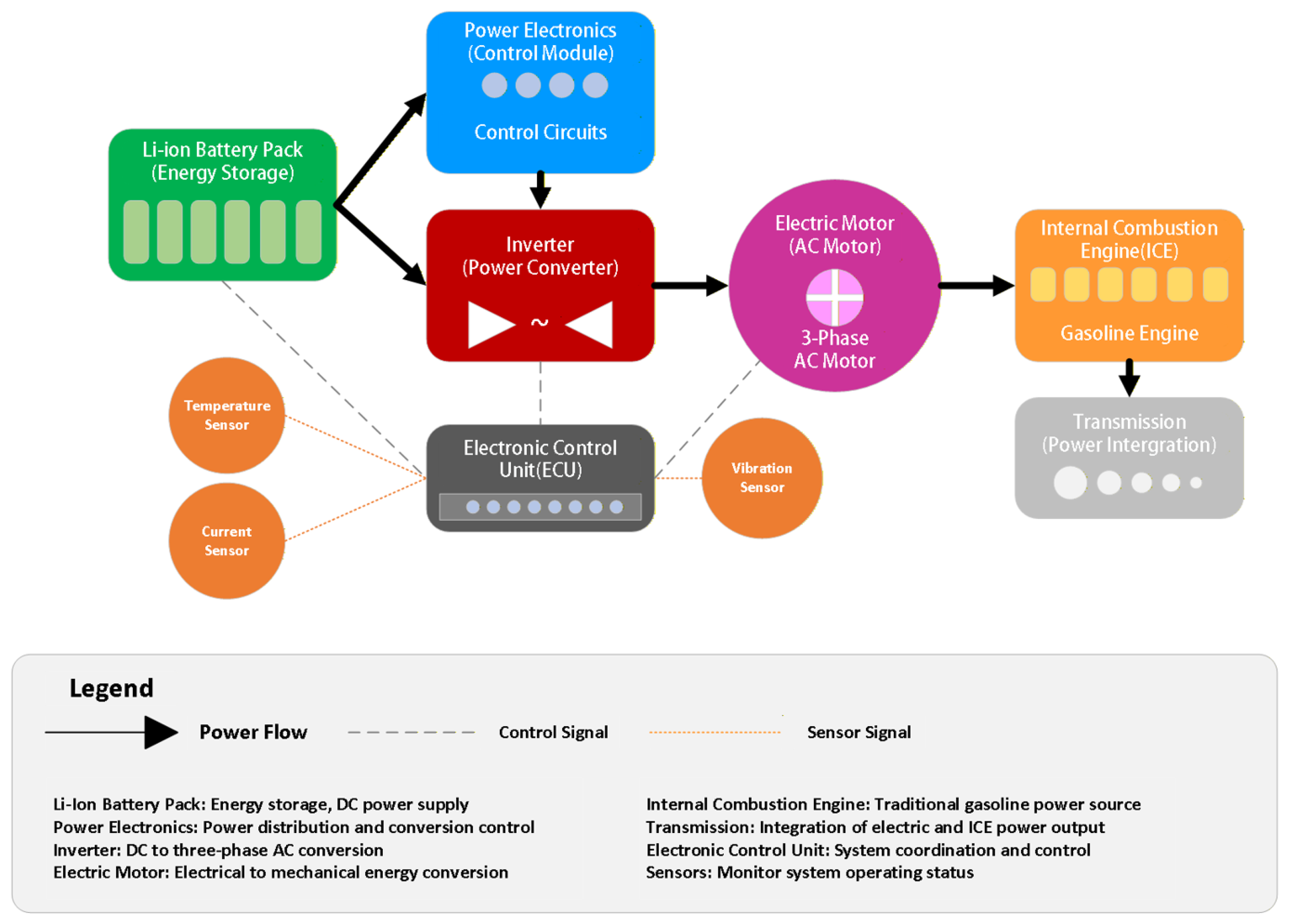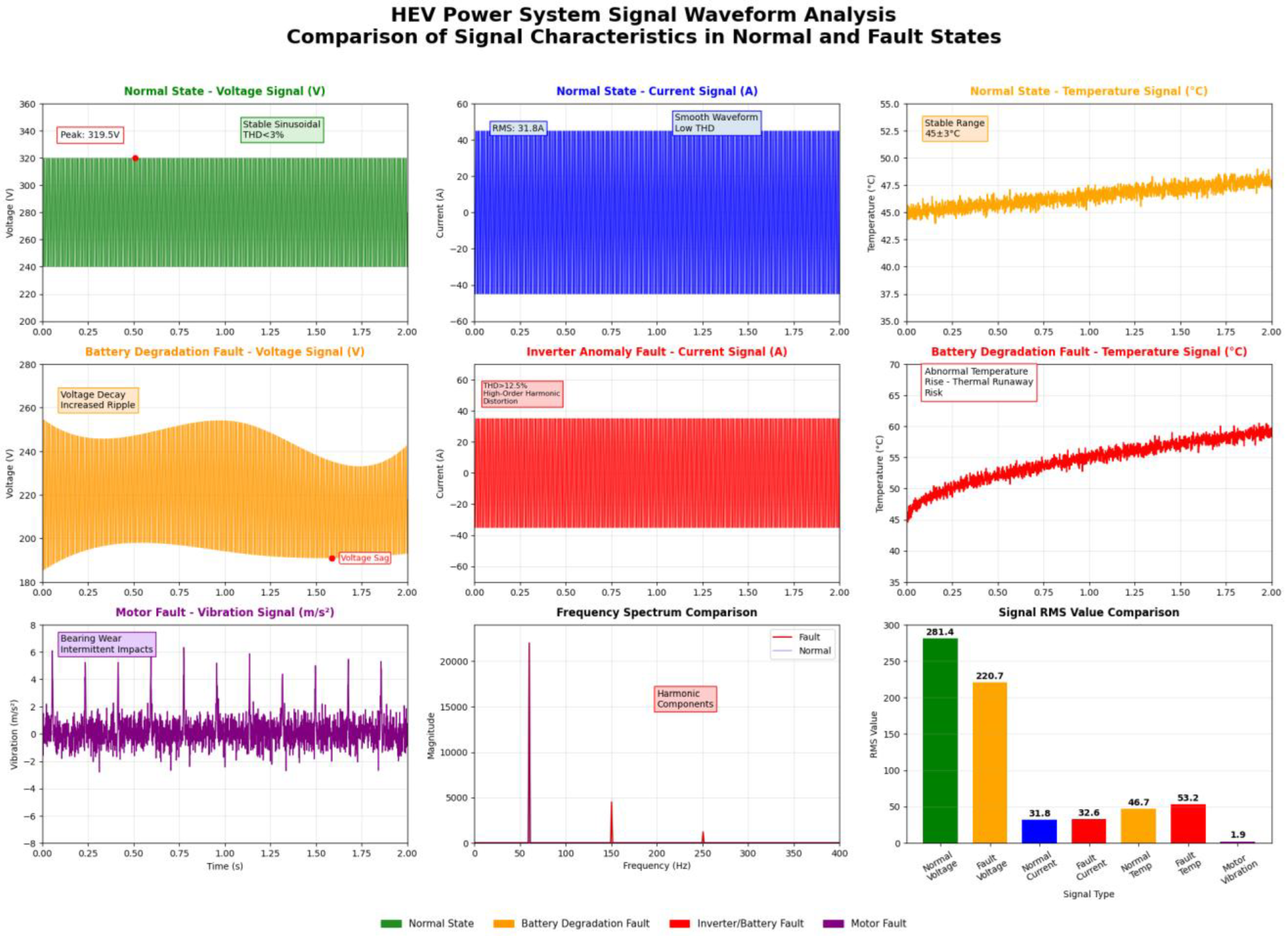 Amid the global transition toward sustainable energy and environmental protection, Hybrid Electric Vehicles (HEVs) have emerged as an indispensable technology in the automotive industry [1]. By integrating an internal combustion engine with an electric power system, HEVs significantly reduce fuel consumption and carbon emissions, aligning with international pursuits of sustainable development [2]. However, the core power system of an HEV—comprising the lithium-ion battery pack, electric motor, inverter, and power electronics modules—faces multifaceted challenges [3]. These components are susceptible to external factors such as ambient temperature fluctuations, load variations, mechanical vibrations, and material aging, which can precipitate various faults [4]. Common failure modes include energy loss from battery capacity degradation [5], power conversion failures due to inverter circuit anomalies [5], and mechanical breakdowns resulting from motor torque fluctuations. Such issues not only degrade the vehicle’s overall performance but may also introduce safety hazards, including unexpected shutdowns or fire risks. Figure 1 illustrates the architecture of the HEV power system and the main components considered in this study.