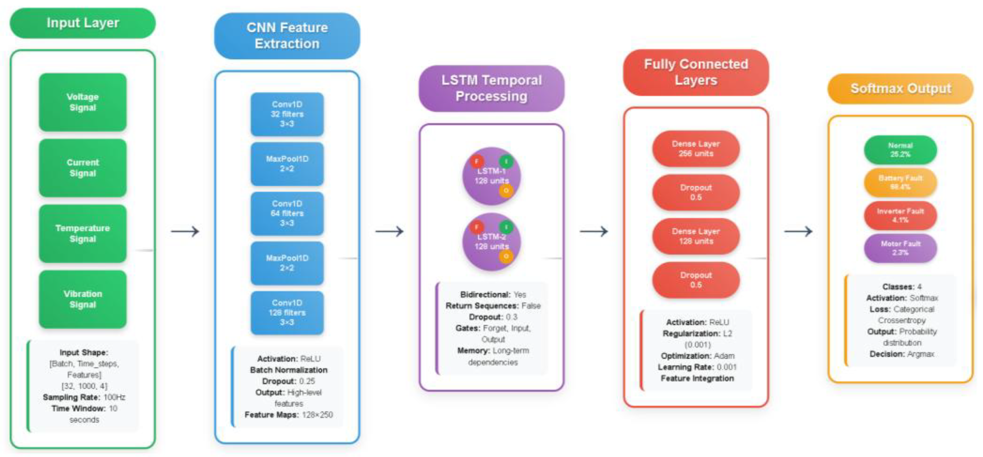 3. Classification Module: The output from the LSTM block is passed to a Fully Connected (Dense) network. This block comprises a dense layer with 256 units, followed by a second dense layer with 128 units. Both layers utilize ReLU activation and are regularized using L2 regularization ( λ = 0.001 ) and a Dropout rate of 0.5. Finally, the output layer utilizes a Softmax activation function to produce a probability distribution across the four diagnostic classes: Normal (25.2%), Battery Fault (68.4%), Inverter Fault (4.1%), and Motor Fault (2.3%). The model is optimized using the Adam optimizer with a learning rate of 0.001.