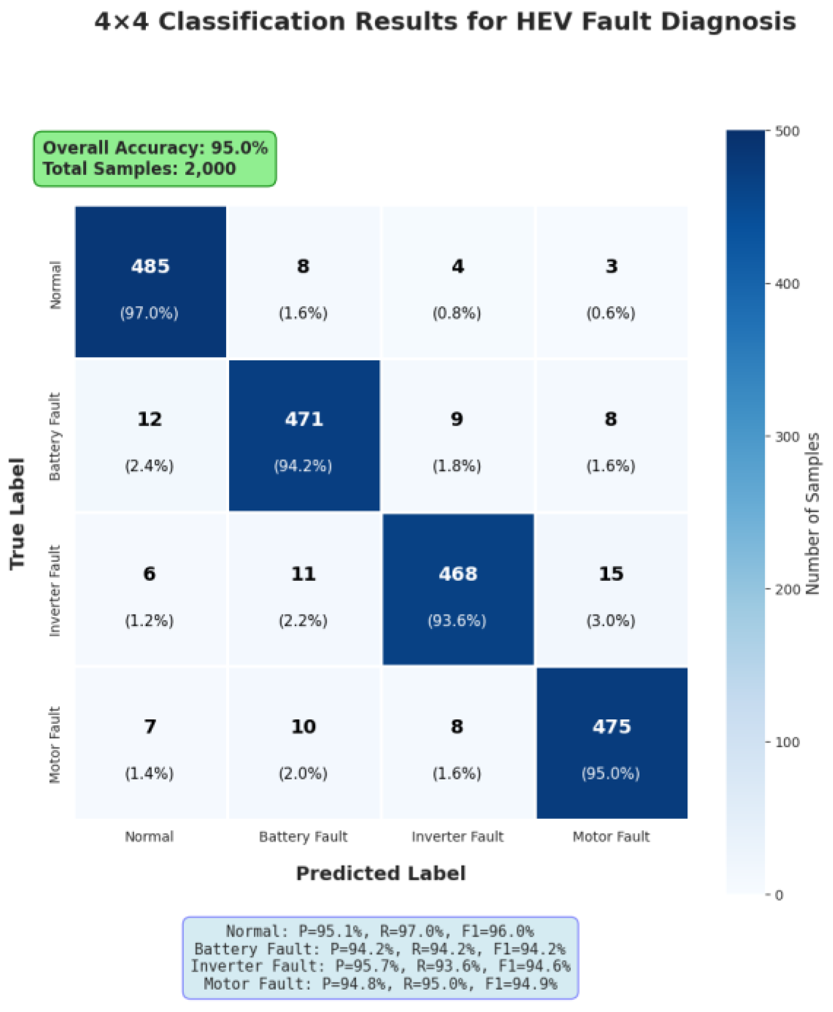 Although SMOTE was used to mitigate class imbalance during training, oversampling may not fully address the challenge posed by rare but safety-critical fault categories in HEV systems. To reduce the potential bias introduced by synthetic samples, a class-weighted cross-entropy loss was incorporated, ensuring that real minority-class samples retain a stronger influence during model optimization. Furthermore, model performance was evaluated on a non-SMOTE validation dataset to verify that the classifier does not overfit synthetic instances. This dual strategy enhances reliability when detecting rare faults that are critical for vehicle safety.