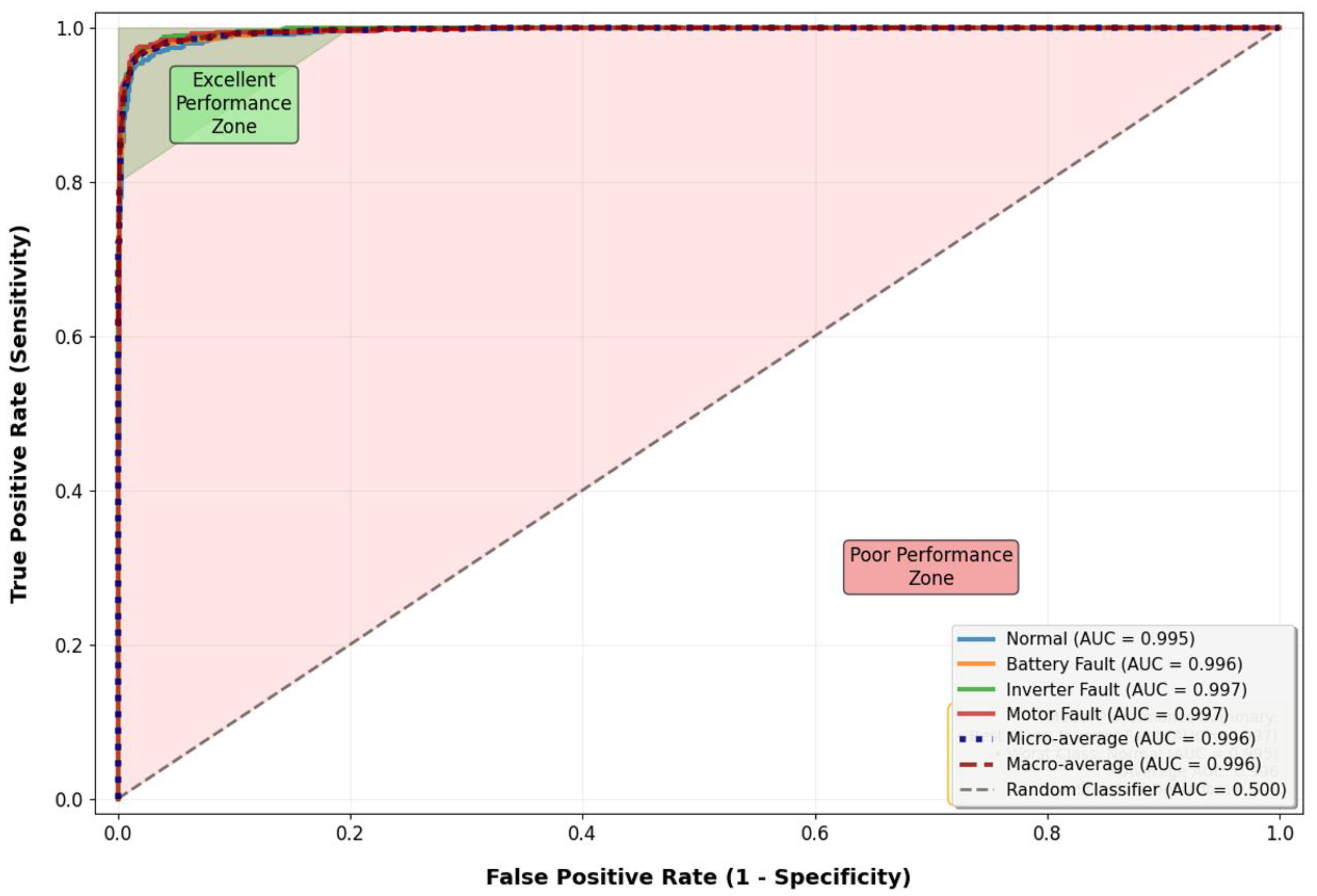 Note: Dataset Detailed Description. Sensor Features Include: Simulation Data: Voltage (V), Current (A), Temperature (°C), Speed (rpm)—4 primary sensor channels; Real-world Data: Voltage (V), Current (A), Temperature (°C), Speed (rpm), Vibration (m/s2), Power (kW)—6 sensor channels. Data Collection Conditions: Simulation Environment: MATLAB/Simulink R2023a, including normal operation and fault injection modes; Real-world Environment: Laboratory test platform, Toyota Prius, CAN bus data recording; Sampling Frequency: Simulation data 100 Hz, Real-world data 50 Hz; Fault Simulation: Battery capacity degradation 20–50%, Inverter circuit noise injection, Motor torque fluctuation ±15%. Data Quality Indicators: High Quality: SNR > 30 dB, Completeness >98%; Medium Quality: SNR 20–30 dB, Completeness 90–98%. Data Preprocessing: Applied SMOTE for class balancing, used Min–Max normalization, and split into training set (70%), validation set (15%), and test set (15%).