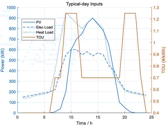 Typical-day inputs and TOU tariff: PV output, electric load, heat demand, and TOU price.