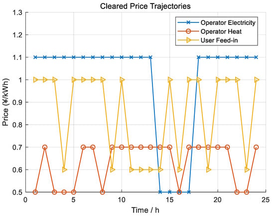 Cleared price trajectories: operator electricity price, operator heat price, and user feed-in price.