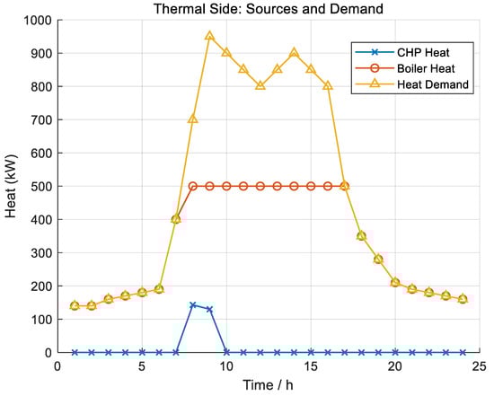 On the thermal side (Figure 6), CHP heat output follows electric co-generation around mid-day, while the boiler heat covers residual heat during morning and evening ramps. The coordinated pricing on the heat channel suppresses uneconomic power-to-heat substitution near noon and maintains thermal balance at low cost.