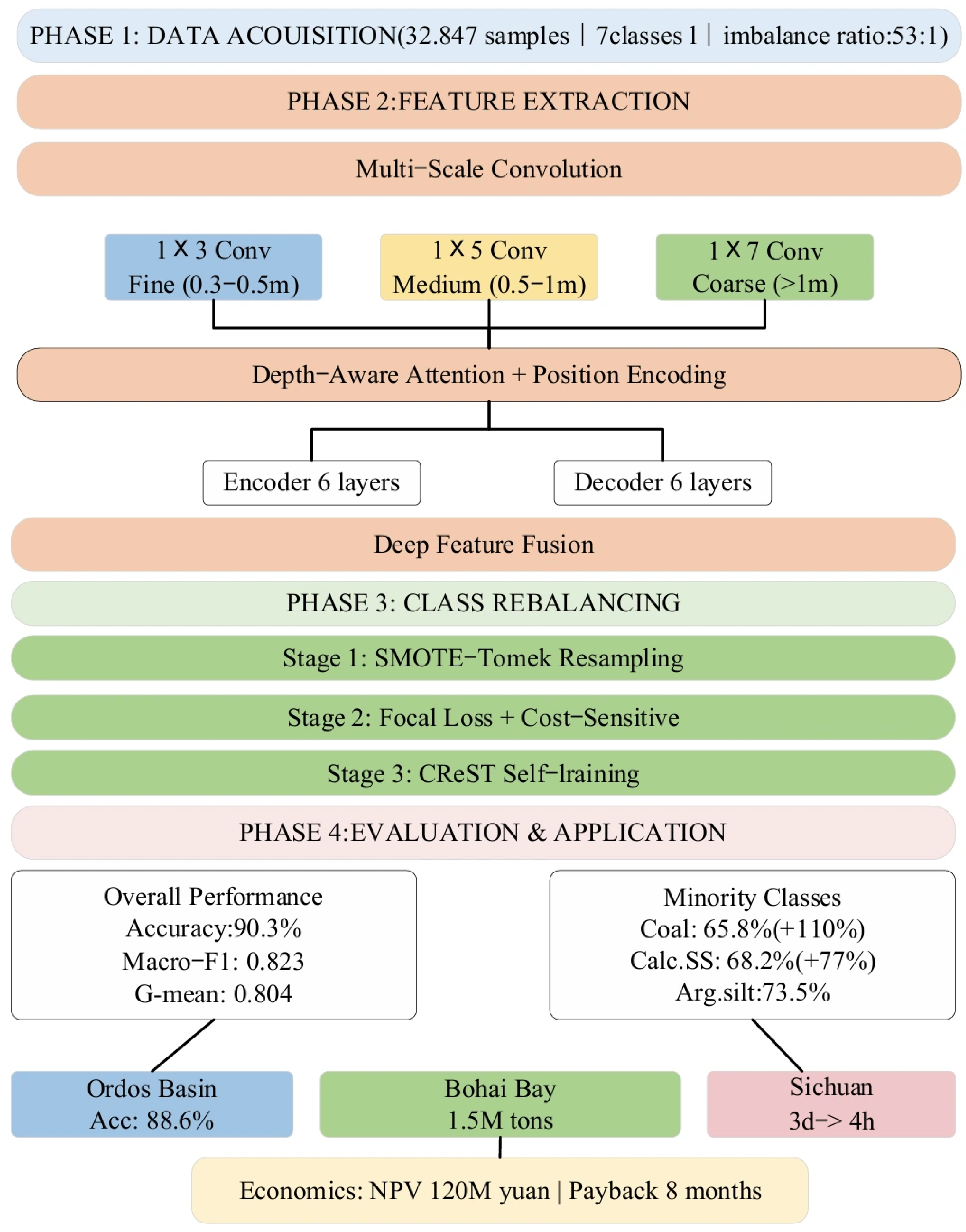 Figure 4, through the synergistic action of the three-stage processing strategy, data distribution improves progressively from an extremely imbalanced initial state to the attainment of balanced performance improvement among all classes. This comprehensive processing framework systematically solves extreme class imbalance problems in logging data, and its effectiveness is fully validated in subsequent experiments [