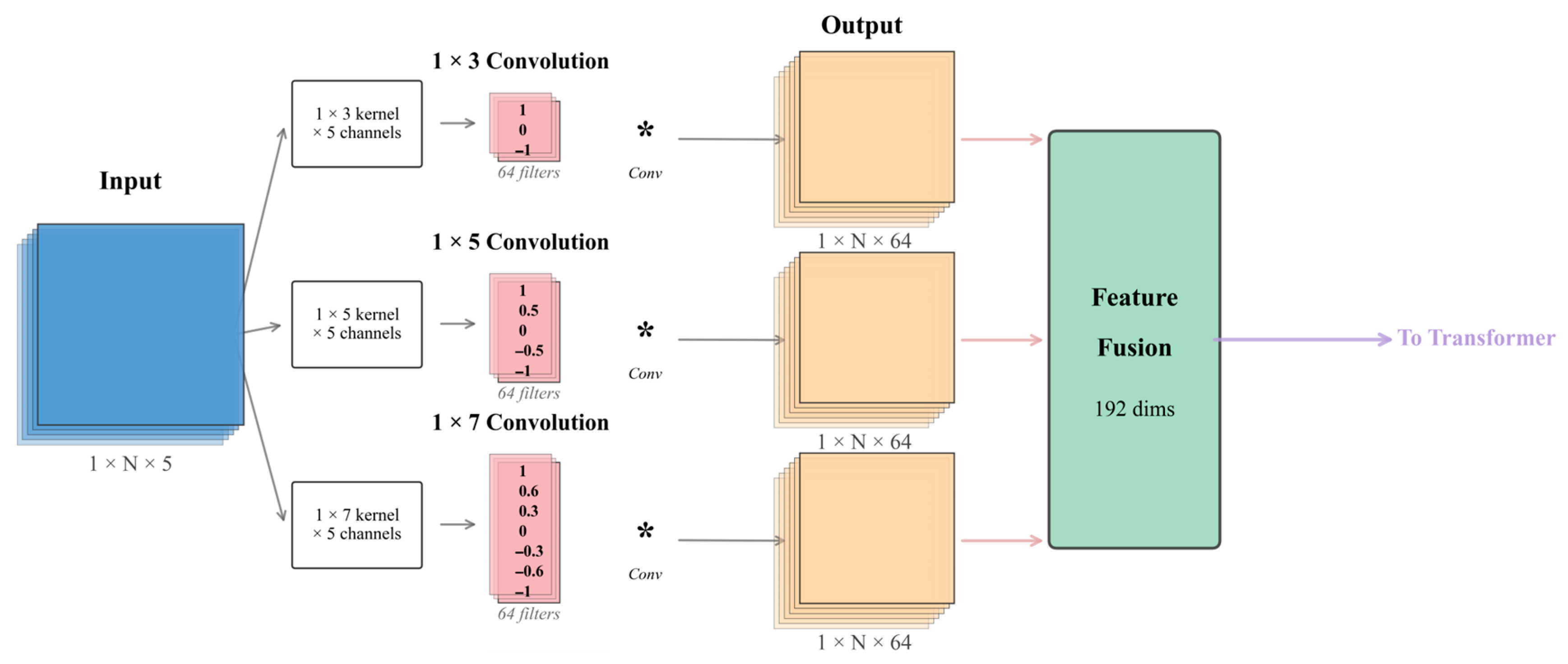 The multi-scale convolutional feature extractor works on the front-end processing module of the network by capturing local features with different receptive fields through three parallel branches. The first branch adopts 1 × 3 convolutional kernels and mainly extracts the fine-grained local variation features that are sensitive to thin layers and rapid lithological changes. All three branches adopt the standard 2D convolutions (not depth-wise or grouped) operating across all 5 input channels simultaneously, learning the cross-channel correlations between the different logging curves (GR, DEN, AC, CNL, RT). This branch adopts 64 convolutional kernels of stride 1 and “same” padding mode to maintain the sequence length. The second branch is made up of 1 × 5 convolutional kernels to capture medium-scale geological features, which could enable the identification of lithological units with thicknesses ranging from 0.5 to 1 m. This is also similarly configured with 64 convolutional kernels, maintaining the dimensions of the feature maps through appropriate padding strategies. The third branch adopts 1 × 7 convolutional kernels, which are responsible for extracting larger-scale geological trends corresponding to the thick layer and gradational transition zone identification. The kernel sizes (1 × 3, 1 × 5, 1 × 7) were designed on purpose to match the sedimentary unit scales at the 0.1524 m sampling resolution: 1 × 3 kernels capture the thin beds of 0.3–0.5 m, 1 × 5 kernels capture layers of 0.5–1.0 m, and 1 × 7 kernels capture units >1.0 m. Several ablation experiments have been conducted to evaluate various alternatives: replacing 1 × 7 with 1 × 9 decreased the accuracy by 0.8% due to the over-smoothing; adding 1 × 9 as the fourth branch increased the parameters by 23% with only a 0.3% gain; and adaptive deformable convolutions improved minority F1 by 1.1%, but it doubled the inference time from 12.5 ms to 24.8 ms. Thus, the configuration with fixed 1 × 3, 1 × 5, and 1 × 7 achieves the best balance between geological interpretability, efficiency, and performance. The outputs from these three branches, each producing B × L × 64 feature maps, fuse through concatenation operations along the channel dimension to form a 192-dimensional multi-scale feature representation, B.