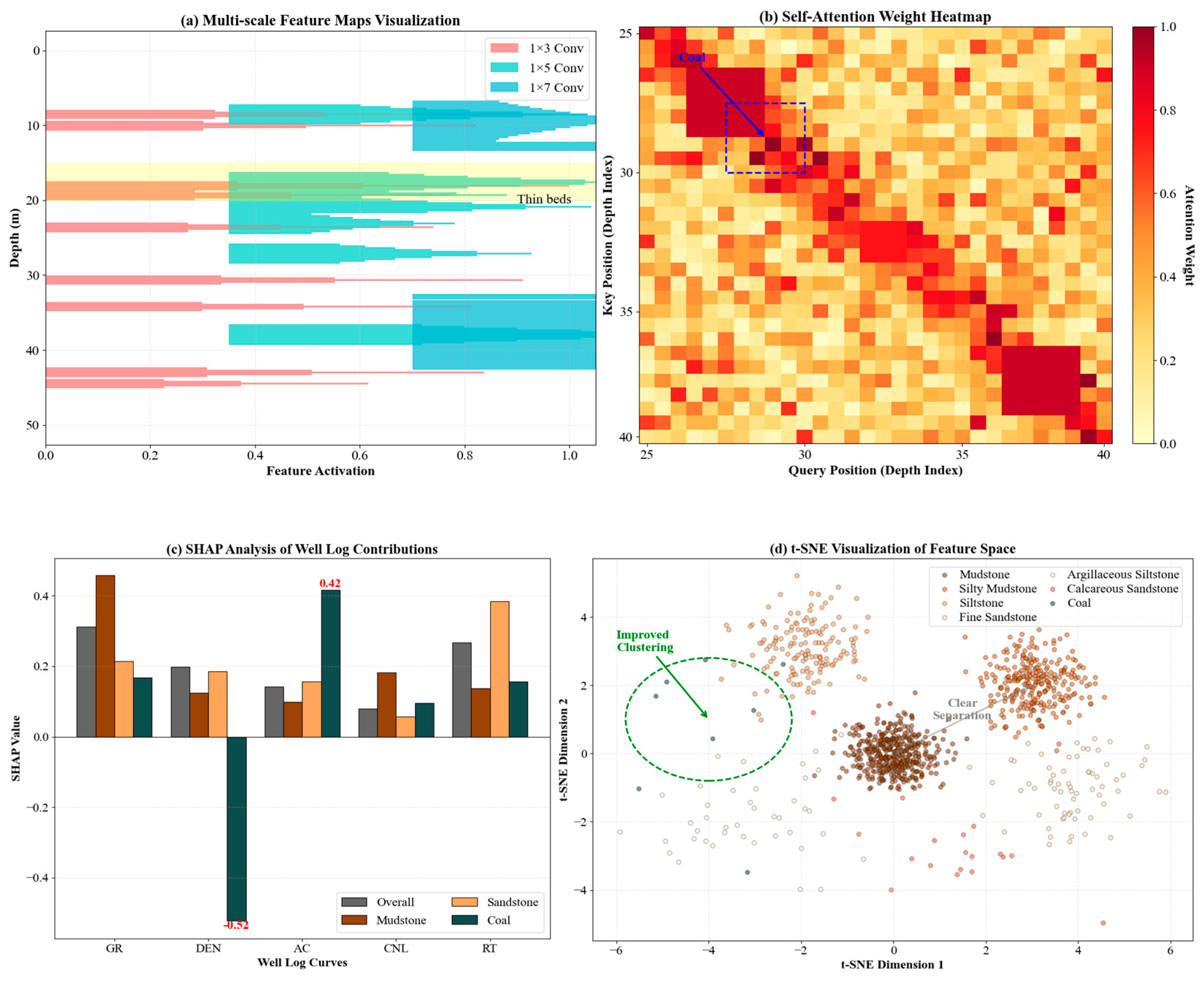 13] but is specifically optimized for characteristics of one-dimensional logging sequence data. This mechanism largely enhances the network’s expression capability for complex geological features through the organic combination of hierarchical fusion, dual attention, and cross-scale interaction, and it provides a powerful feature foundation for accurate lithology identification.