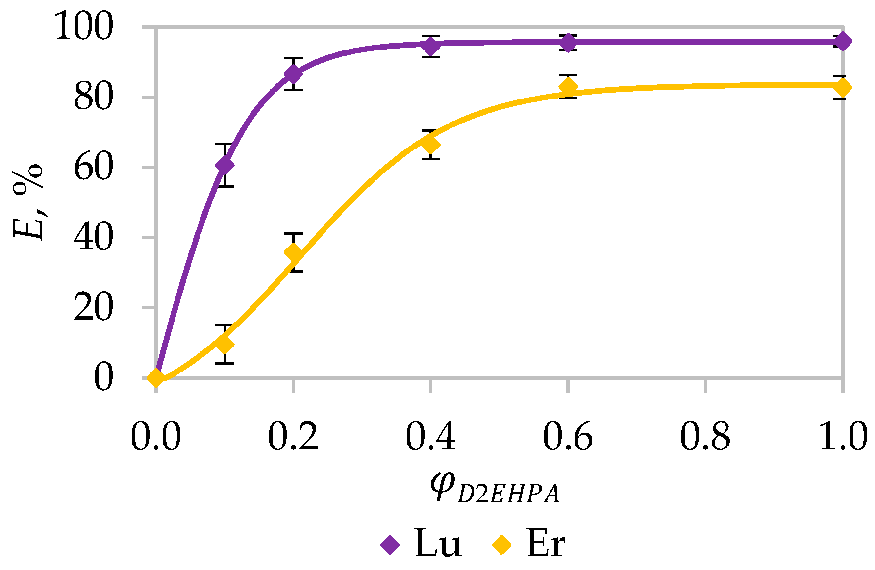 Given the primary objective of this work—a fundamental kinetic analysis of individual heavy rare earth elements—a simplified model solution was rationally employed. The model faithfully replicates the aggressive and constant chemical background of the industrial stream: 4.5 M H3PO4 and 0.19 M H2SO4. This preserves the most critical and challenging aspect of the real system, namely the highly acidic, high-ionic-strength phosphate matrix. However, to eliminate cross-interference and allow precise determination of kinetic parameters for each element, the complex multi-component mixture of REEs present in the industrial feed was substituted with single-element solutions of the target HREEs: lutetium, thulium, yttrium, erbium, and dysprosium. The REE concentrations in these solutions ranged from 2 to 5 mmol/L, reflecting their typical content in the industrial feed.