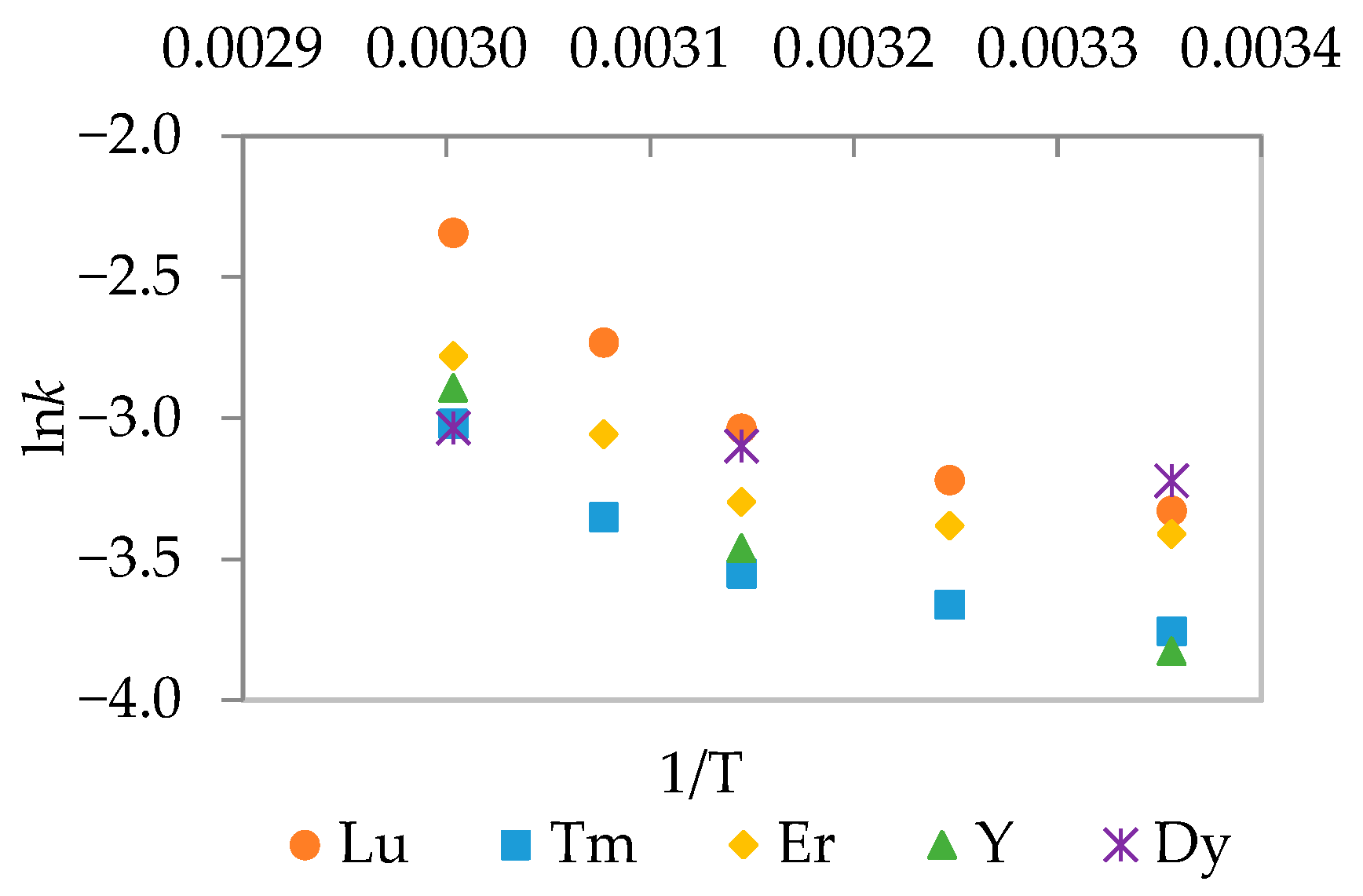 The slope of these linear plots, representing the apparent rate constant k, exhibited a significantly greater dependence on stirring intensity than on temperature. This observation strongly suggests that the overall extraction rate is limited by diffusion through the aqueous boundary layer. An identical dependence was confirmed for all other investigated heavy rare earth elements.