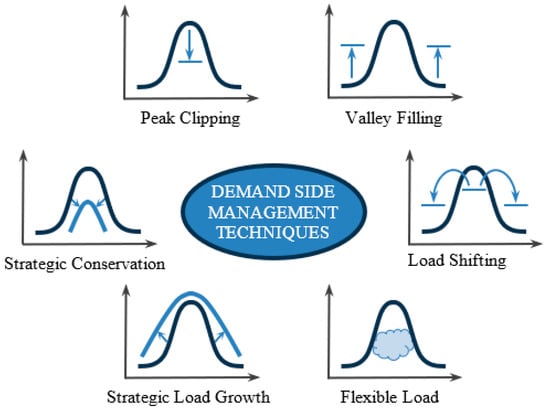 DSM modifies customer demand patterns to accomplish the desired change in the load shape of the power network. DSM techniques adjust load patterns by moving the demands made by shiftable appliances during peak hours and relocating these loads to a more cost-effective time. Within DSM, the load pattern that indicates power consumption can be altered in six ways [5]: peak clipping, valley filling, load shifting, flexible load shape, strategic conservation, and strategic load growth. A graphical representation of all six techniques is depicted in Figure 1. The peak clipping [6,7] technique is a direct load control technique that aims to reduce the peak of a customer’s load profile at designated times. As a result, both the peak demand and overall energy consumption are reduced. Valley filling [8] is a form of load management technique that increases or builds off-peak loads. This technique is preferable if a utility has excess capacity during off-peak hours. The net effect of this technique results in an increment in total energy demand but no change in peak demand. Load shifting is the most effective and widely used load management technique. It essentially moves electricity consumption from one time period to another by shifting the load from peak time to off-peak time. The net effect is a decrease in peak demand but with no change in total energy demand. The strategic conservation [7] technique involves reducing overall energy consumption by encouraging consumers to use energy-efficient appliances and devices. The net effect is a reduction in both peak demand and the total energy demand. Strategic load growth [6] tends to increase the market share of loads supported by energy conservation and storage systems or distributed energy resources. Peak demand and overall energy usage both rise as a result. Typically, it is executed by either raising energy intensity or bringing on board additional clients. For example, an area with four power plants can generate 400 MW, but the peak demand at any time of the day goes up to 300 MW, with 100 MW remaining idle for the entire year. Now, the task at hand involves the establishment of a customer base or the provision of incentives to encourage companies to purchase or utilize energy from the available sources. Flexible load shapes improve smart grid reliability by finding customers with flexible loads who are prepared for that to be managed during critical periods in exchange for a variety of incentives [6,7]. Thus, the government needs to identify such consumers, namely, those who can work at any time period of the day. When the government asks them to operate during peak periods, they should be ready to do so. If the government asks them to stop their production, they should be able to stop production. And, if the government asks them again to start production during the off-peak period, they should be ready to start production during off-peak hours. These flexible consumers need to be identified in a region by providing some incentives for them to flexibly change their operating schedules. The overall results may be a reduction in peak demand and a change in total energy usage.