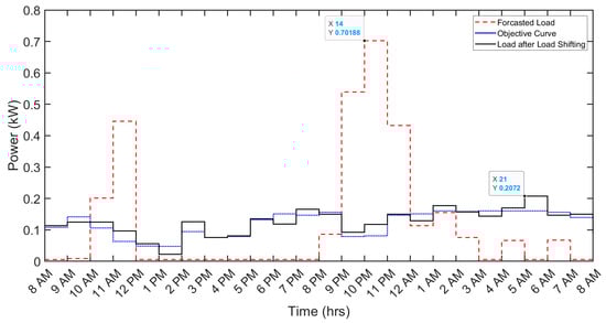 Accurate load forecasting is important to take maximum advantage of the DSM technique, i.e., load shifting. The forecasting results utilized in this study were extracted from ensemble machine learning models that demonstrated superior performance in a previous study [34]. The forecasted data derived from these models form the basis for the DSM strategies used herein. By utilizing these forecasting results, the aim is to identify the objective curve that guides decision-making under specific conditions. Data from hourly forecasted loads obtained from ensemble learners are utilized for the DSM technique. The proposed algorithm is designed for one-day-ahead load shifting, i.e., a 24-h window size from 8 a.m. to 8 a.m. This 8 a.m. to 8 a.m. window size was carefully chosen for load-shifting applications to improve consumer comfort and flexibility in managing their appliance usage. By starting at 8 a.m., users have the flexibility to adjust their appliance usage well before or well after potential peak hours. The 8 a.m. to 8 a.m. window size, therefore, aims to strike a balance between accommodating user preferences and maximizing the opportunities for effective load shifting. Table 2 shows the hourly forecasted load data with real-time pricing [23] for a 24-h window size.