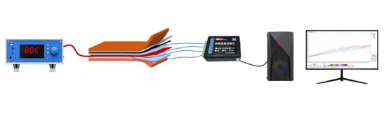 To verify the feasibility of the heating method, thermocouples were embedded on the prepreg surface and between its layers to monitor real-time temperatures at multiple locations. The temperature measurement setup is illustrated in Figure 3. Temperature data was recorded by a six-channel data logger (Smarei Technology Co., Ltd., Beijing, China), covering the range from room temperature to 130 °C. The layout of the flexible pad functional layers during temperature measurement was consistent with that in the forming experiment.