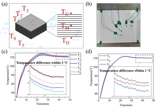 The center of the first prepreg layer was designated as the origin (measuring point T1), with additional points positioned along the horizontal and vertical axes. Test 1 included six measurement points: the origin T1, points T2 and T3 located 50 mm and 100 mm from the origin along the x-axis, and points T4 and T5 placed 50 mm and 100 mm from the origin along the y-axis. This test focused on measuring the temperature distribution in the horizontal direction, as shown on the left side of Figure 4a. Test 2 aimed to measure the temperature distribution in the vertical direction, displayed on the right side of Figure 4a. Centered at point T1, additional points TU, TM, and TD were added along the z-axis. Point T1 coincided with TU, and TU, TM, and TD corresponded to the top, middle, and bottom layers of the prepreg. Figure 4b is the actual schematic diagram of the temperature measurement process.