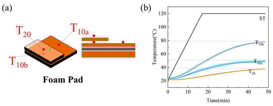 A preliminary selection of the foam pad thickness was conducted. Test 3, illustrated in Figure 5a, included two trials: one using 10 mm foam pads and the other using 20 mm foam pads. The temperatures at the center of the upper foam pad surface during heating were recorded as T10a and T20, respectively. For direct comparison, the 20 mm pad was replaced with two stacked 10 mm pads, and the interface temperature was recorded as T10b. The results of Test 3, shown in Figure 5b, revealed consistent trends across both trials. The outer surface temperature of the 20 mm foam pad increased more slowly. Thirty-five minutes after the prepreg surface reached the set temperature, this surface measured approximately 38 °C, creating a 14 °C difference from the 24 °C ambient temperature. By contrast, the surface temperature of the 10 mm foam pad reached 80 °C at the same timepoint, resulting in a 56 °C differential. According to Newton’s law of cooling, thermal dissipation efficiency is proportional to the temperature difference. Consequently, compared to the 10 mm pad configuration, the 20 mm pad reduced the overall heat dissipation capacity by approximately 70%. Simultaneously, the 30 °C differential between T10a and T10b confirmed that the 20 mm foam pad provided significantly enhanced insulation performance during heating.