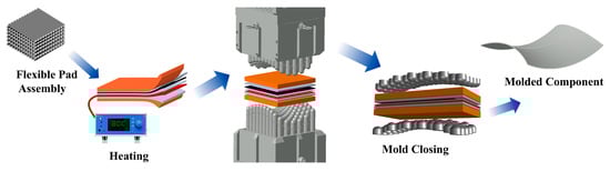 In sectors like aerospace, the use of multi-material assemblies is growing increasingly common [1,2], with composites emerging as a key alternative to metals. Thermoset composites are widely used in aerospace due to their light weight and high strength [3,4], yet their widespread application is limited by high costs, stemming from two main aspects. First, energy costs: mainstream autoclave curing for thermoset parts consumes a great deal of energy, and manufacturing larger parts requires bigger autoclave equipment, pushing up expenses significantly. Second, mold costs: this is especially true in the aircraft industry, where composite usage is high. The low-volume, high-variety nature of parts leads to low tooling utilization rates, forcing manufacturers to customize dedicated molds for each part configuration. These molds not only take up considerable storage space but also need regular maintenance, which together drives up production costs. To reduce energy consumption in composite curing, several alternative methods have been developed as alternatives to autoclave curing. Walczyk et al. [5] designed aluminum molds with embedded resistive heaters, which achieved a ±1 °C surface temperature uniformity for compression-molded composites. The same team later conducted a study [6] applying 3.0 MeV electron beam curing to epoxy-acrylate resin as a replacement for thermal curing; this approach significantly shortened cycle times while eliminating high-temperature energy consumption. Gu et al. [7] developed two rapid-heating solutions through epoxy resin modifications: these included silicone rubber heaters with embedded resistive wires and an internal heating method that leverages carbon fiber conductivity to fabricate carbon fiber laminates. To address mold cost challenges, multi-point tooling technology [8,9,10] provides unique advantages. It enables flexible surface reconfiguration by adjusting pin heights, thereby theoretically materializing the “universal mold” concept that has been successfully applied in metal forming fields, such as ship hull plates [11], aircraft wing skins [12], and titanium alloy cranial prostheses [13].