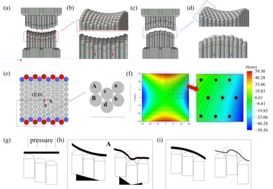Figure 7e illustrates the defect formation mechanism under Approach A. When the tooling surface is configured into a saddle shape, the curvature variation in the surface gradually intensifies from the center of the tooling outward. Based on central symmetry, six pins in the third quadrant (satisfying A > B; a > b; c > d) were selected as the analysis area. In this region, the pin height decreases monotonically as the y-coordinate decreases (A > B; a > b; c > d), while the pin height decreases as the x-coordinate increases (A > a; B > b). During the forming process, adjacent pins jointly support the sheet material. Pins A, c, and a collectively maintain the continuity in the x-direction, which requires satisfying the condition A > c > a. Since the x-coordinate of pin c is smaller than that of pin a, as the y-coordinate decreases, the height of pin c decreases more significantly than that of pin a. When the y-coordinate of pin A is relatively large, the condition c > a holds. However, as the y-coordinate continues to decrease, this relationship is eventually reversed. By the edge of the saddle-shaped surface, the height of pin c becomes lower than that of pin a (c < a).