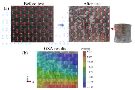 (a) Example of nodes for GSA before and after the test. (b) strain results in second fiber direction (Dy) from GSA.