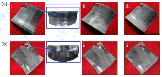This heating method is more energy-efficient than oven heating. Taking the forming of a 25 cm × 25 cm component as an example, a 2-h heating process was implemented. The heating pad used in this study has a power density of 0.4 W/cm2 and an area of 900 cm2, consuming 0.72 kWh of energy. When using oven-based forming, the mold dimensions must be taken into account. For an oven with an internal volume of 50 m3 and a rated power of 1.5 kW, the total energy consumption is 3.0 kWh. The oven indirectly heats the mold and component by warming the air inside the chamber through thermal convection and radiation. In contrast, the heating pad directly contacts the prepreg via its electrical heating elements, transferring heat to the composite through conduction. Almost all the generated heat is used to heat the product itself.