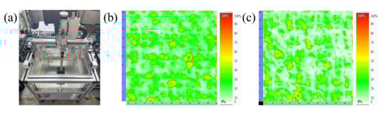 (a) C-scan equipment; (b) Ultrasonic C-scan image of the hot-pressed component; (c) Ultrasonic C-scan image of the oven-cured component.