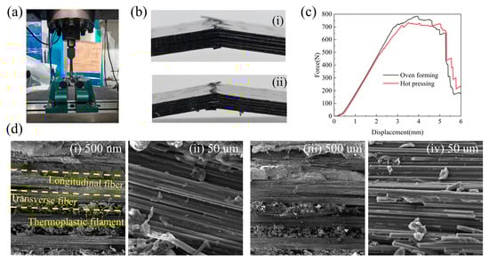 (a) WDW-200 universal testing machine; (b) Photograph after the bending test: (i) oven-cured component (ii) hot-pressed component; (c) Force-displacement curves; (d) SEM images of the fracture surfaces of flexural specimens fabricated by different forming processes: (i,ii) hot-pressing; (iii,iv) oven-forming.